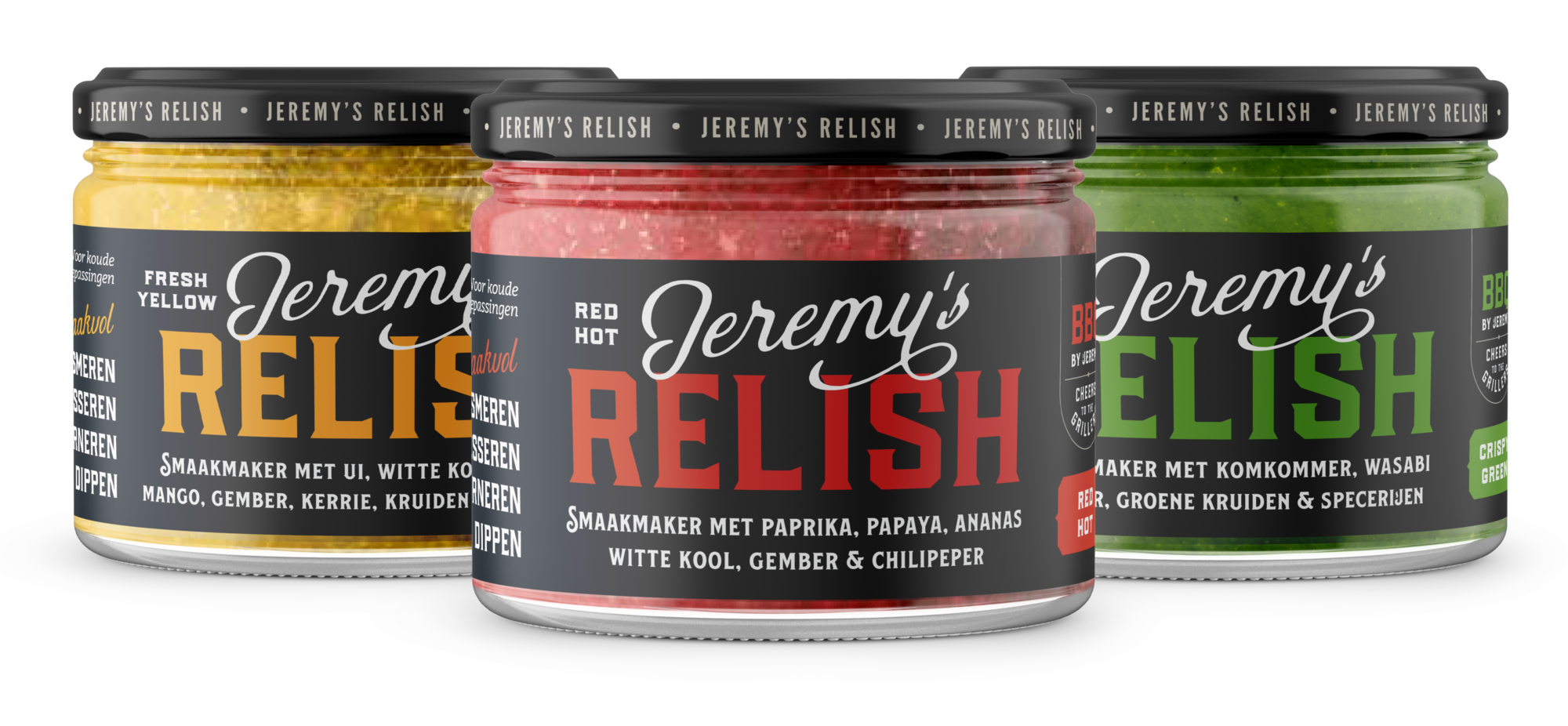 Jeremy Vermolen introduceert zijn eigen RELISH; het extra complimentje bij jouw gerecht. Jeremy’s RELISH een smeltkroes van smaken en vrolijke kleuren. Het is een mengelmoes van verschillende ingrediënten zoals groenten en fruit, maar ook een samenspel tussen de toegevoegde kruiden, specerijen en zuren. Het haalt de smaak van je gerecht naar boven. Jeremy’s RELISH zit in een glazen pot met stoere zwarte deksel en is gebaseerd op de techniek van tafelzuur (zoals ingelegde augurken, atjar, piccalilly). De RELISH voeg je koud toe als veelzijdige smaakmaker aan je gerecht. In de Nederlandse keuken nog onbekend, maar in de Caribische en Zuid-Amerikaanse keuken super populair!